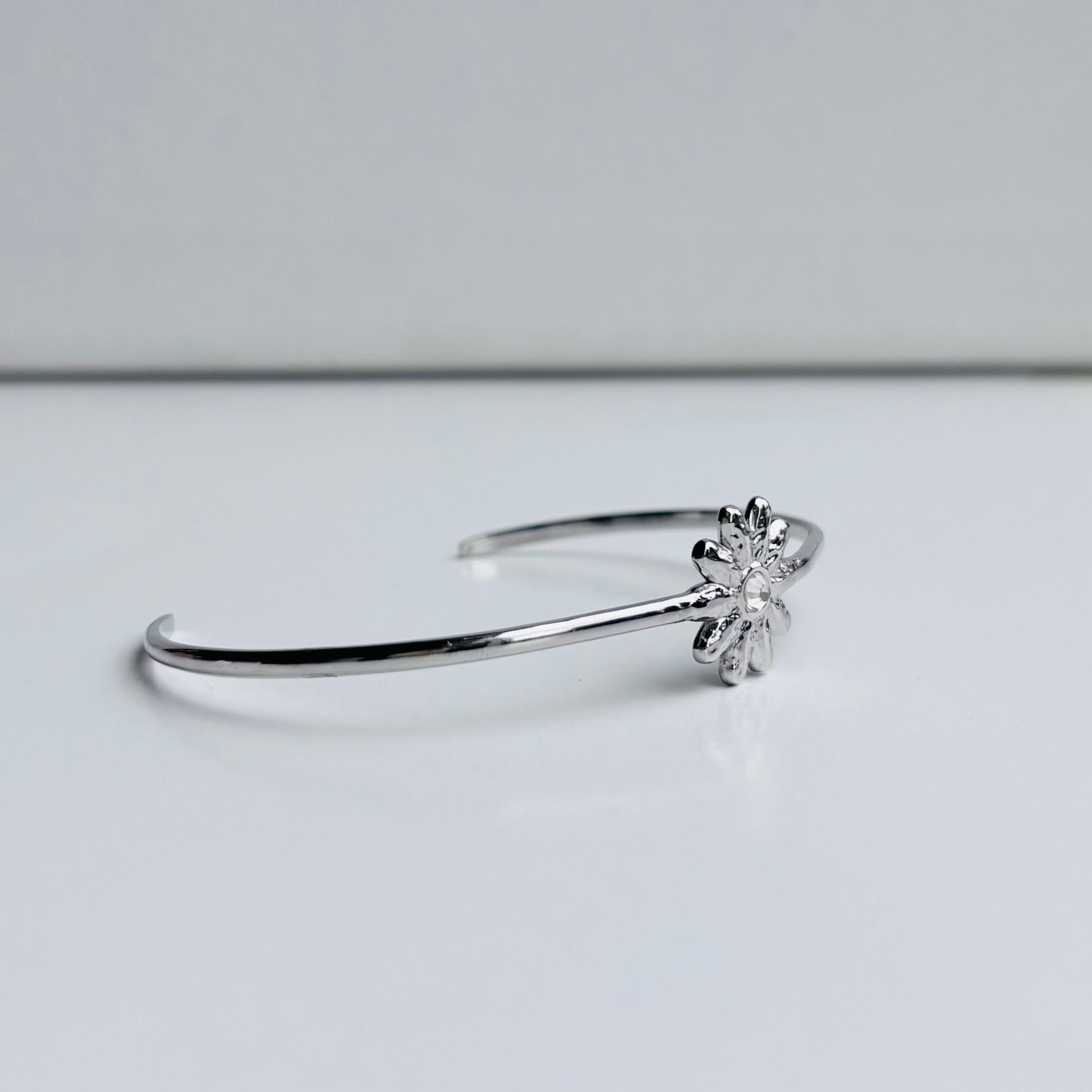 ジルコニアが中央で可憐にきらめく、お花のモチーフが愛らしいカフバングル。