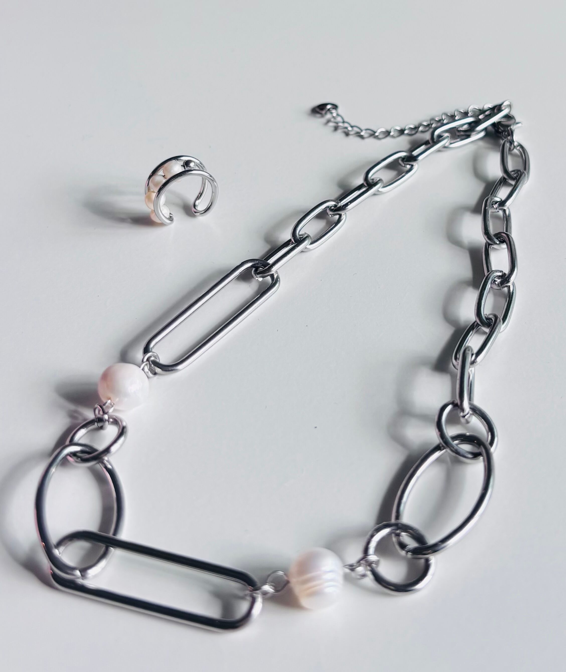 存在感のあるボリュームチェーンにバロックパールのついたネックレスの2点セットの