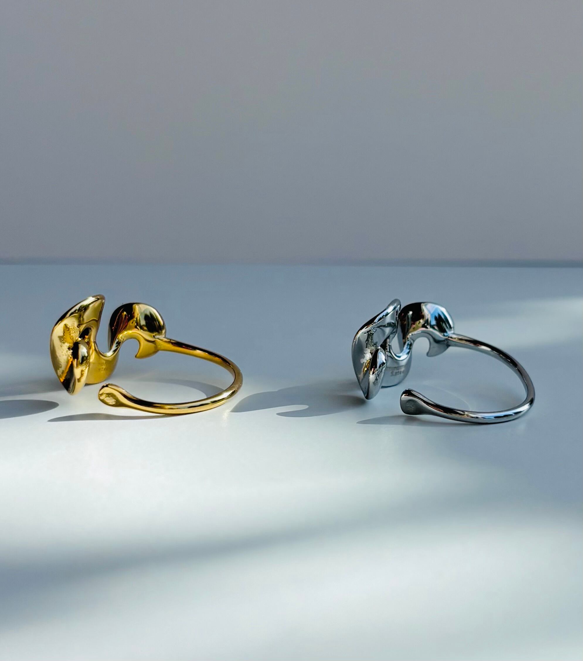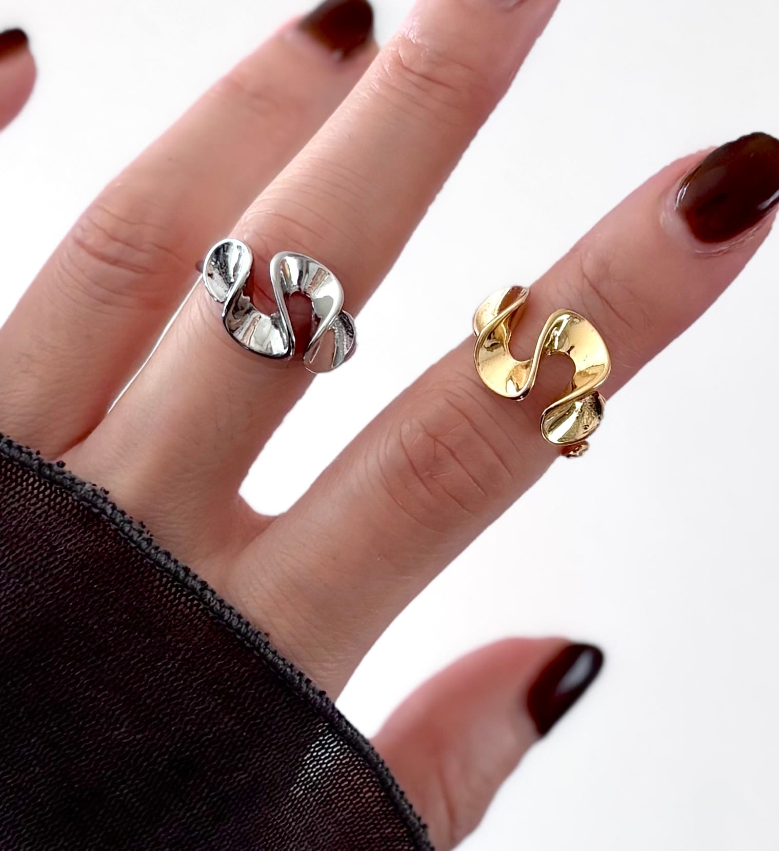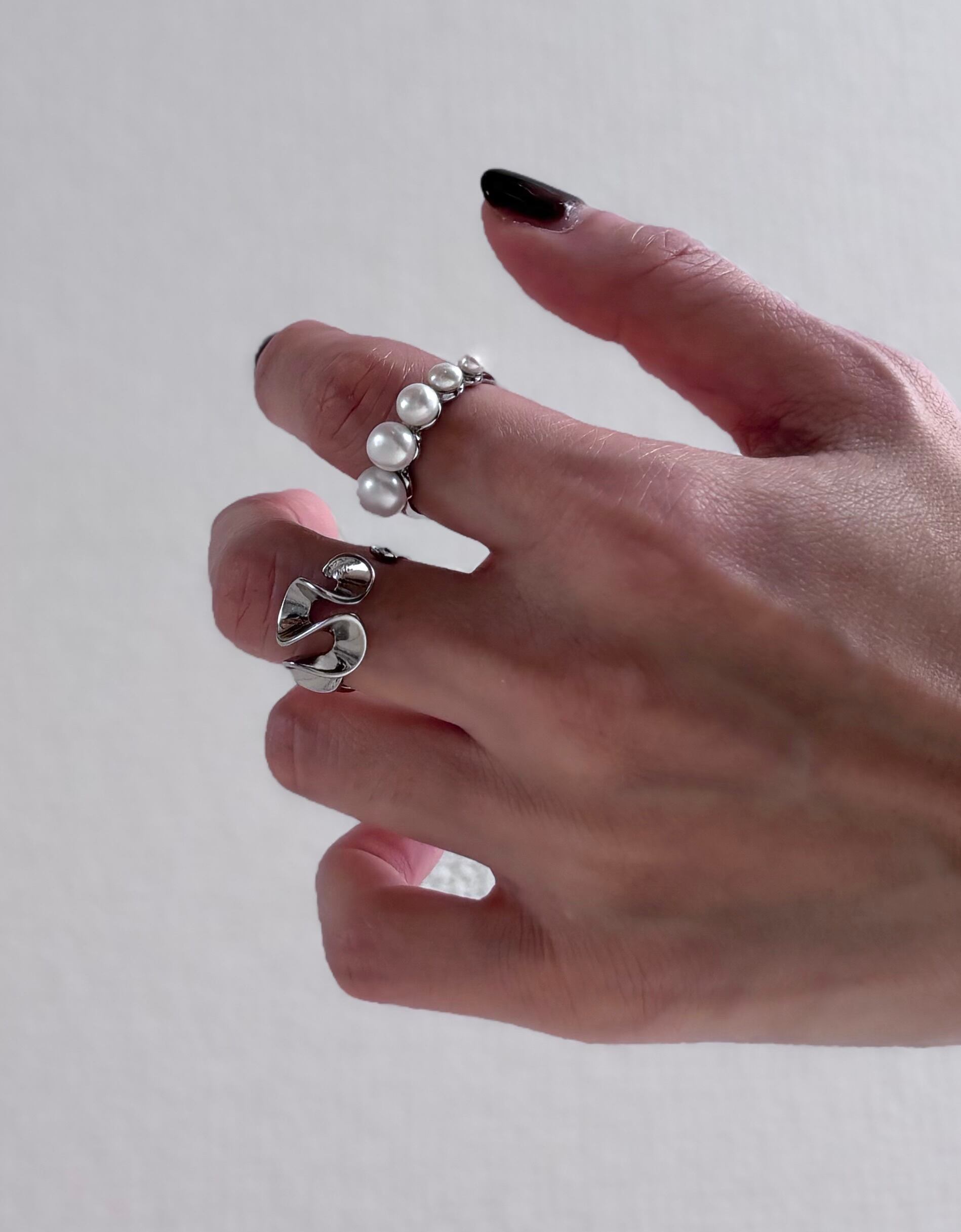 金属を大胆にひねったような立体的なフォルムが特徴的なリングは、アームの部分が細身なので、大ぶりなフリルでも指がすっきりと見えます。