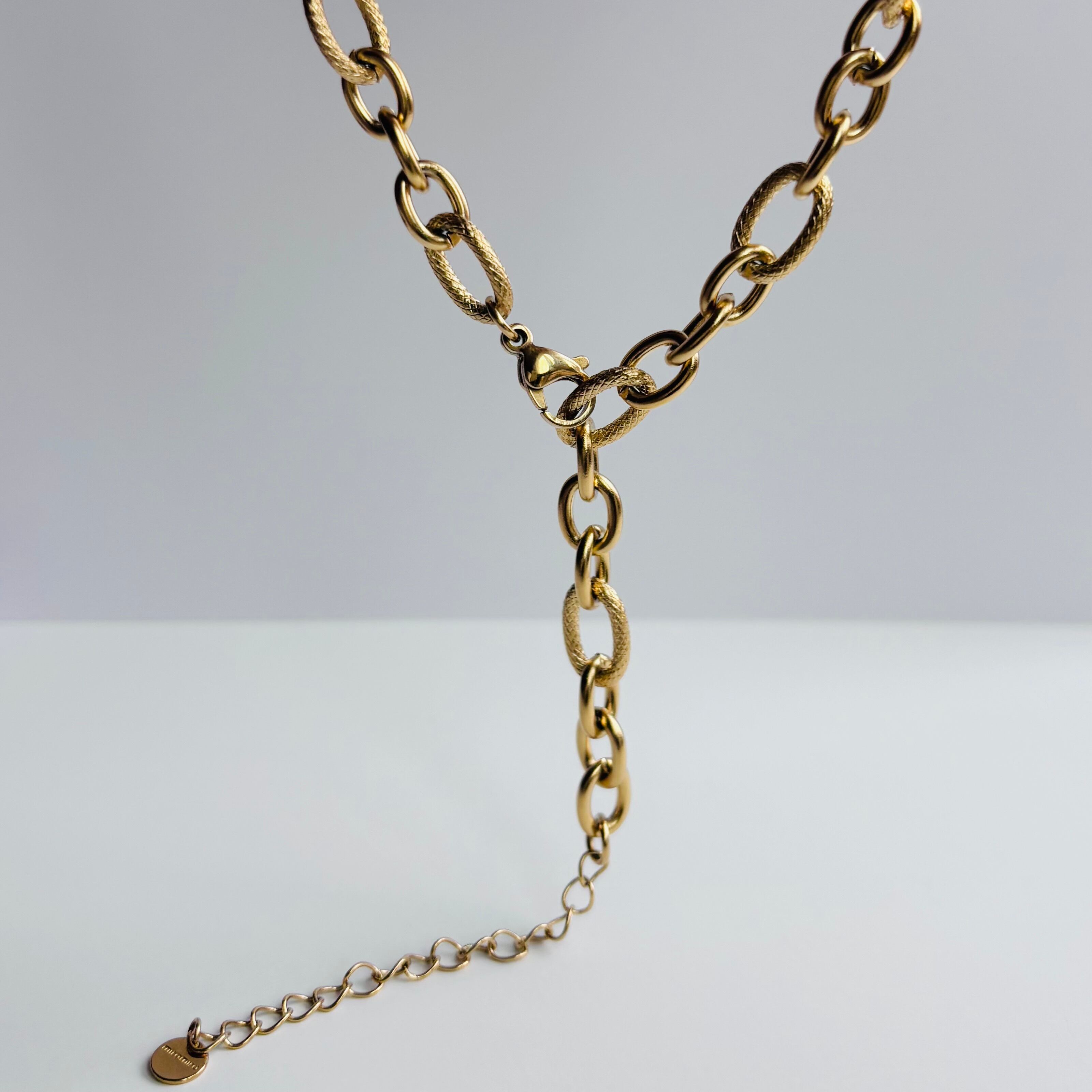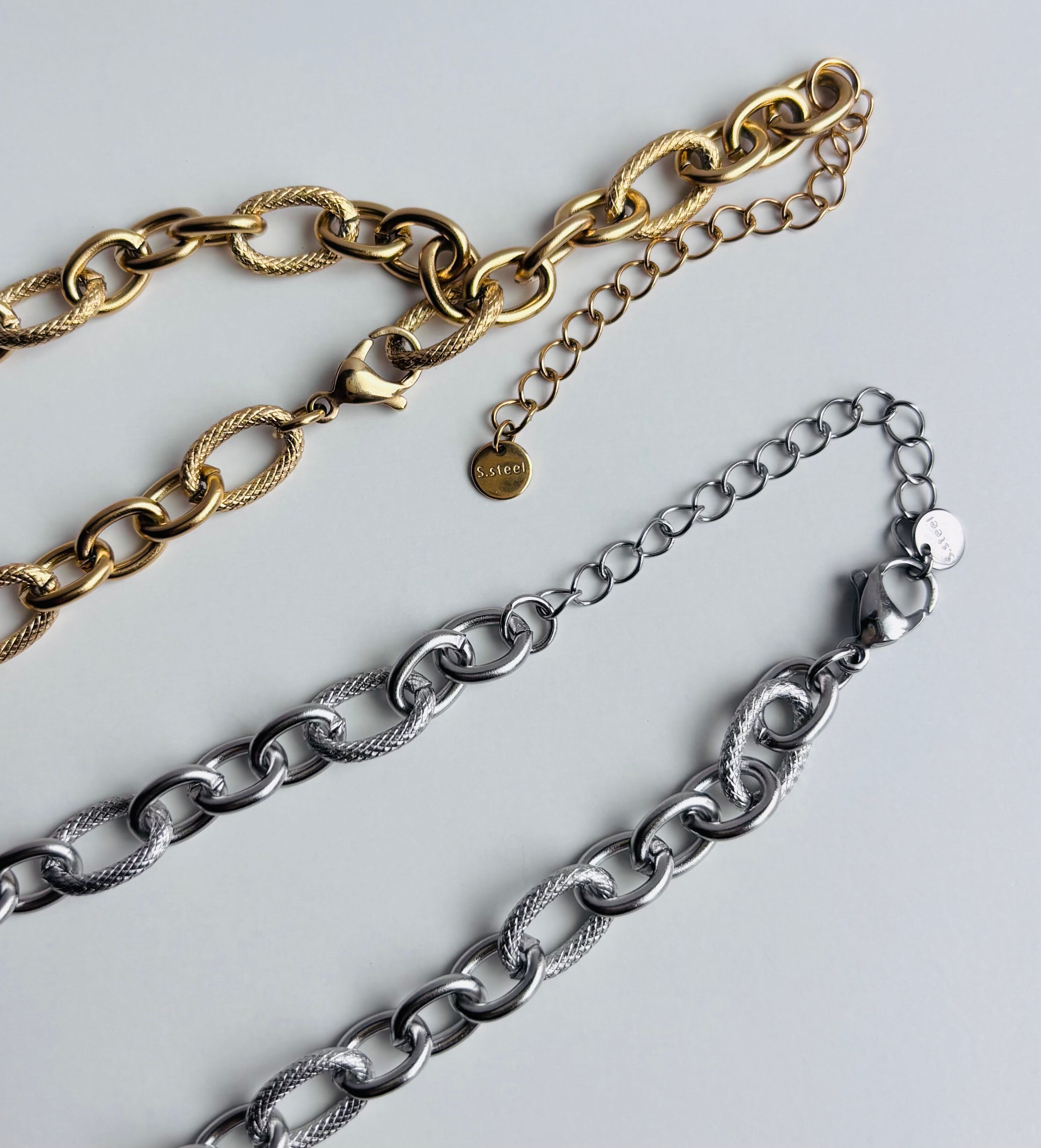 少しだけマットなリンクと、繊細な網目の入ったリンクのチェーンネックレス。