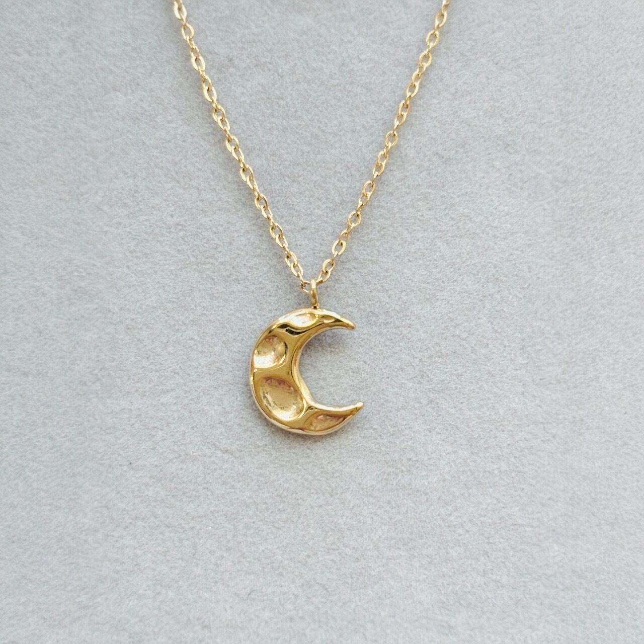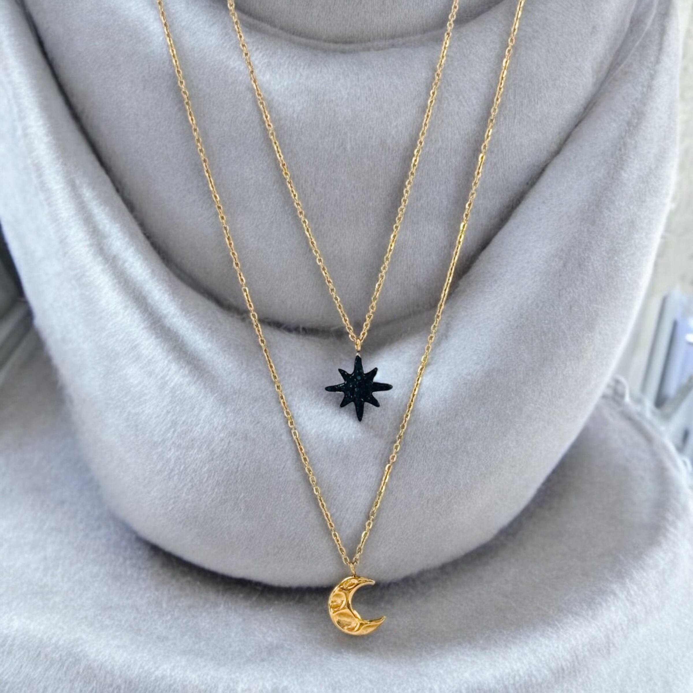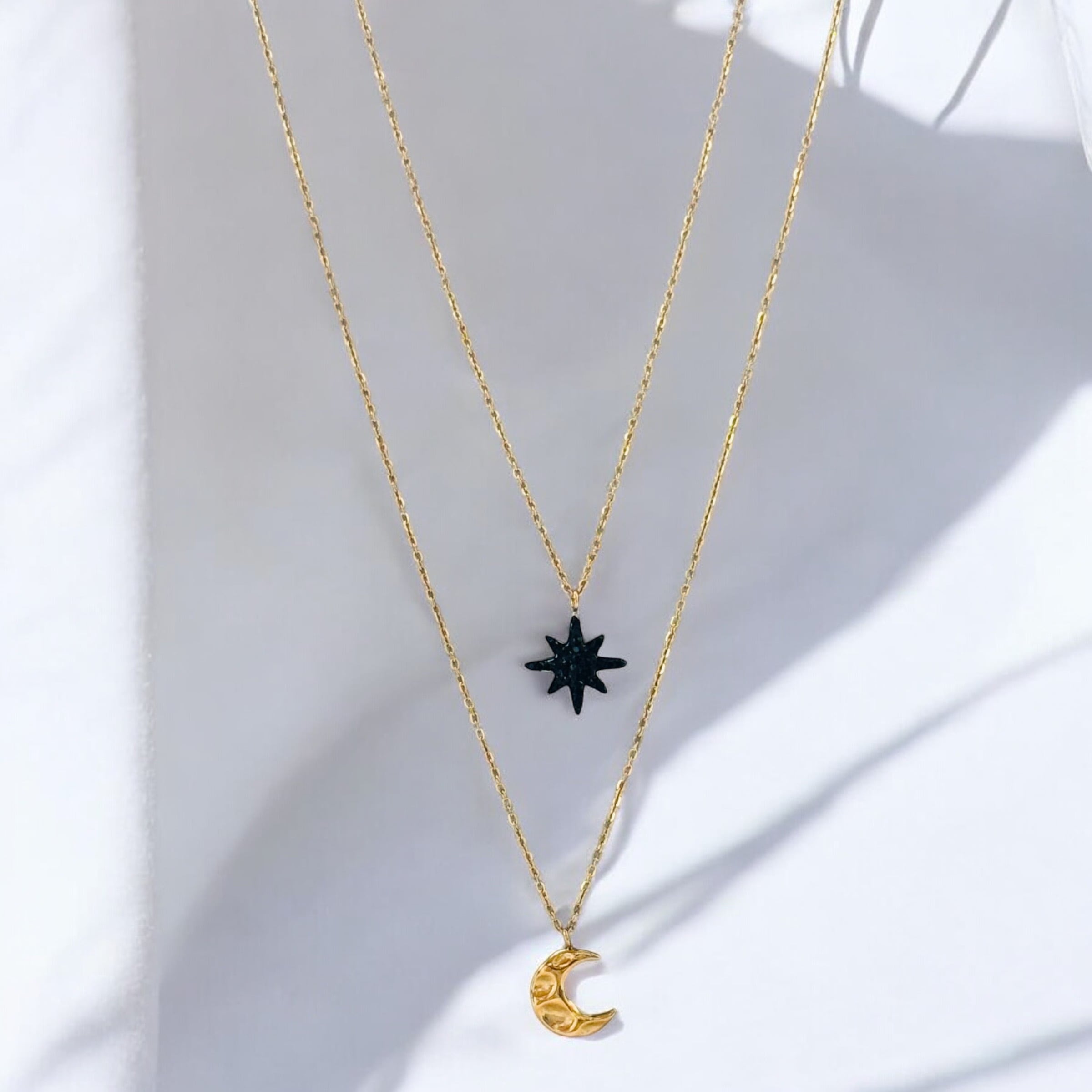 長さの違うチェーンに月と星のモチーフのデザインの2連のネックレス。
