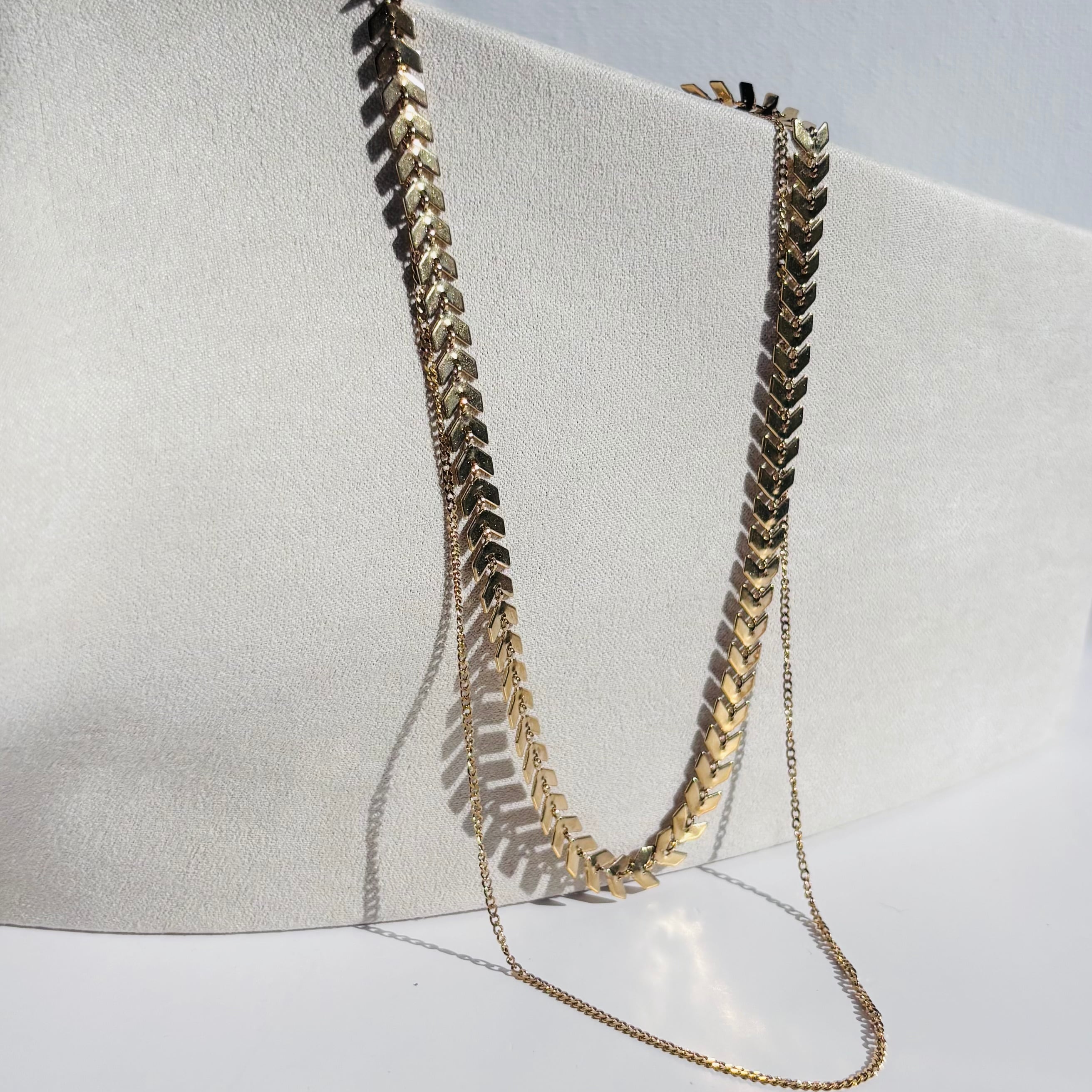 異なる太さのチェーンが織りなす、洗練されたレイヤードネックレス。