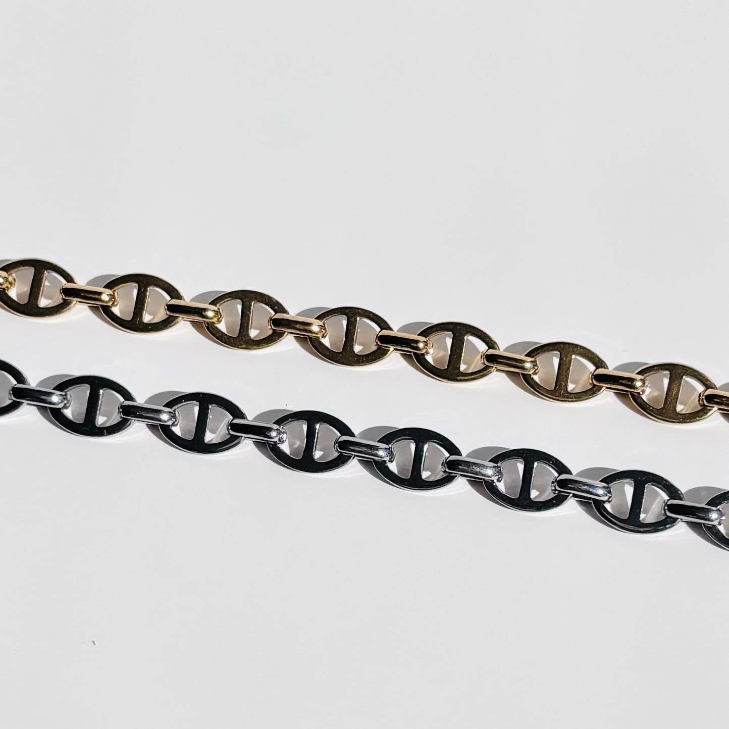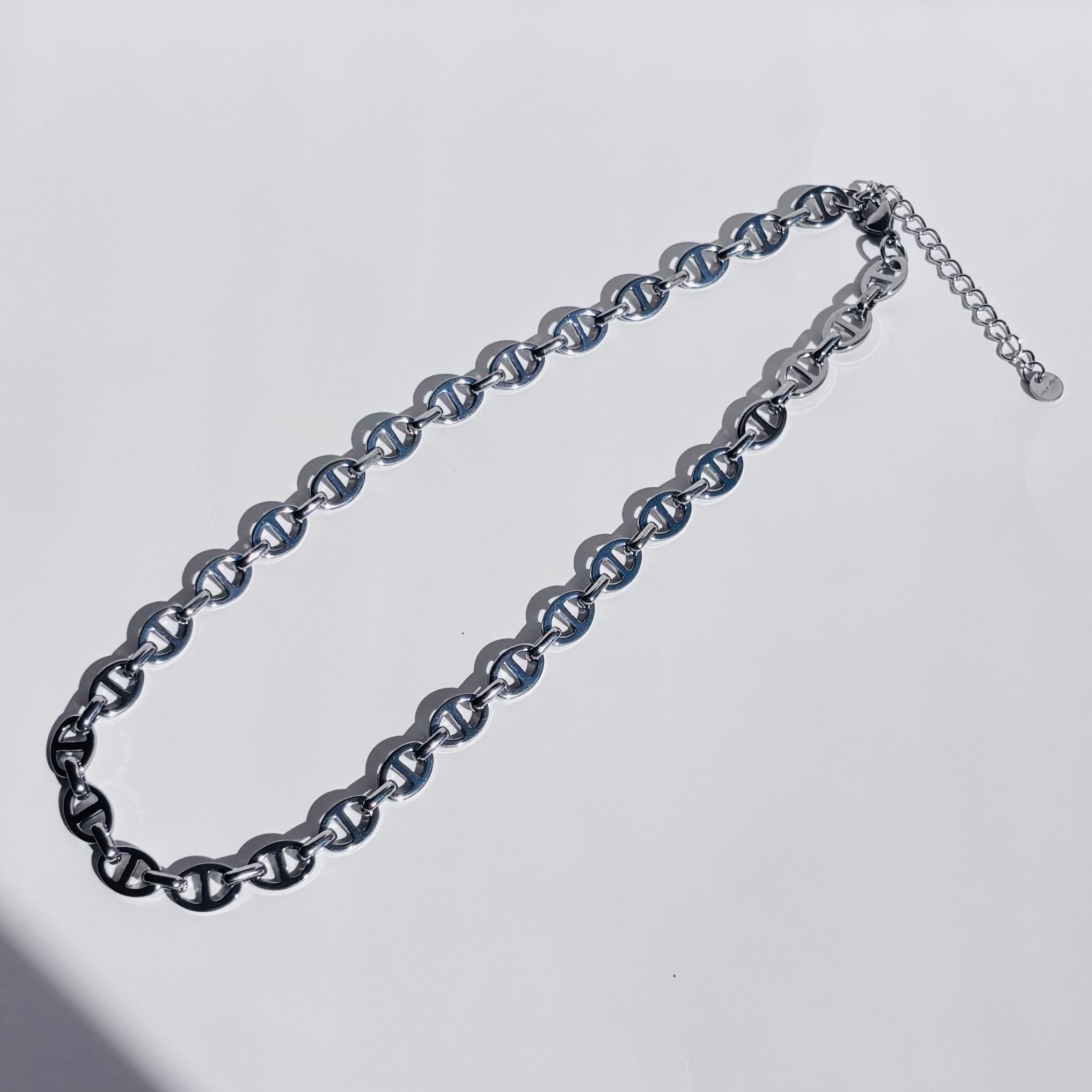 トレンド感のあるマリーナチェーンが、首元にモードなアクセントをプラス。